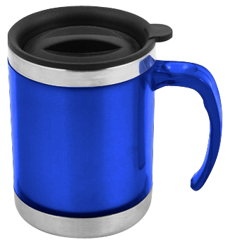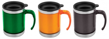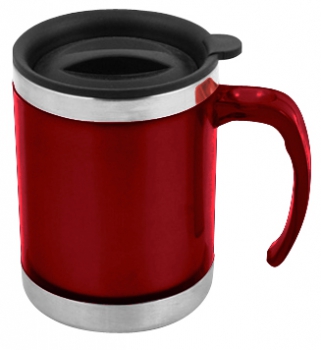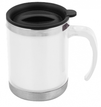 Mug térmico de doble pared aislante con tapa pull-up de PVC negro y dosificador. Base interior de Acero Inoxidable y pared exterior de PVC traslúcido.