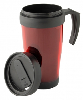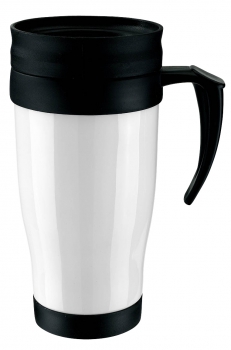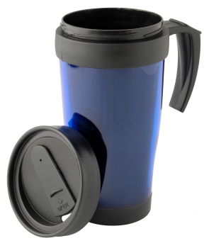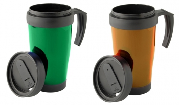 Mug térmico de doble pared aislante con tapa rosca y dosificador. Interior y tapa de PVC negro y exterior de plástico traslúcido.