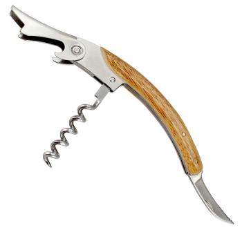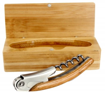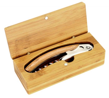 Multiherramientas para el vino, en caja sólida 100% madera Bamboo, con cierre mosquetón envejecido. Incluye descorchador, destapador y abre-sellos.(1)