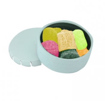 Pastillero promocional, sistema de cierre clic clac, con deliciosas gomitas de sabores.