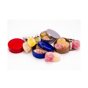 Pastillero circular metálico, sistema de cierre clic clac, con gomitas.