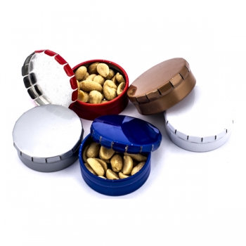 Pastillero circular metálico, sistema de cierre clic clac, con manà salado.