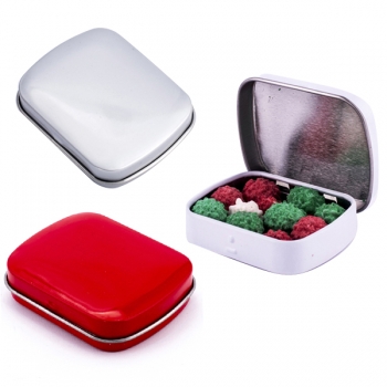 Pastillero rectangular metálico, sistema cierre presión, con manà cubierto de dulce.
