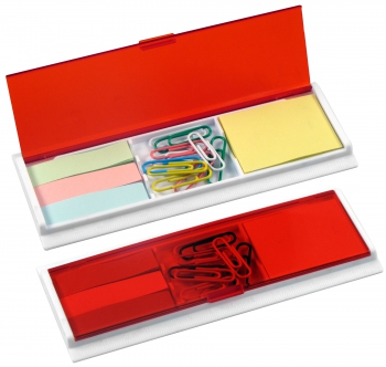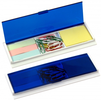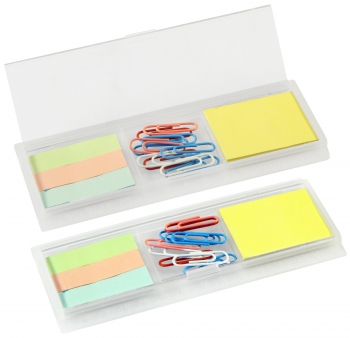 Porta Post-it con Clips de colores. Incluye 1 taco post-it de 40 hojas de 4,8 x 3,6 cm + 3 tacos de 25 banderitas post-it de 4,8 x 1,2 cm + 10 clips recubiertos de colores. Regla de 14 cm y de 5,5\". (1)