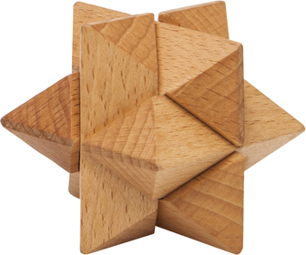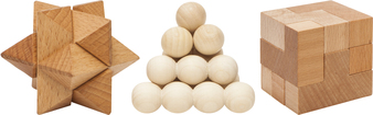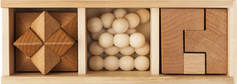 26 x 7,9 x 7,2 cm. Madera. Juegos de madera 3 en 1. Un rompecabezas para armar una estrella, otro para armar un cubo y otro con piezas en forma de pelotitas para armar una pirámide. Estuche de madera con divisiones y tapa de plástico. Con caja.