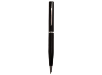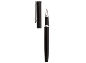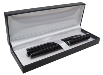 Metálico electro plateado negro. Contiene un lápiz pasta y un roller ball. Clip, puntera y aro con detalles plateados. Pasta negra. Estuche doble. 02