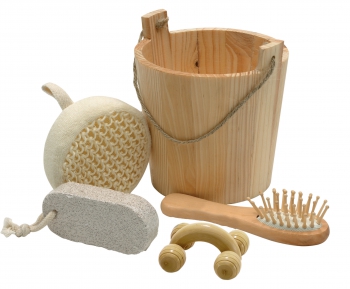 13,3 x 14 cm Madera. Set con cubeta de madera, esponja, piedra/lima, masajeador y cepillo pequeño de cabello. (2)