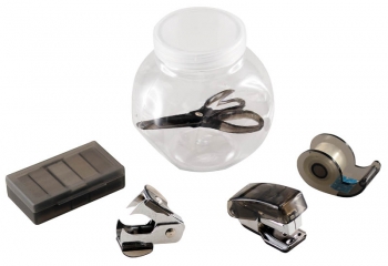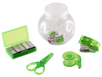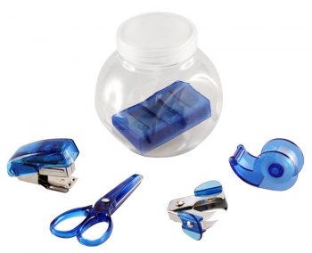 Set de oficina en frasco plástico transparente con tapa frozen. Ideal espacio para logo en tapa.