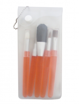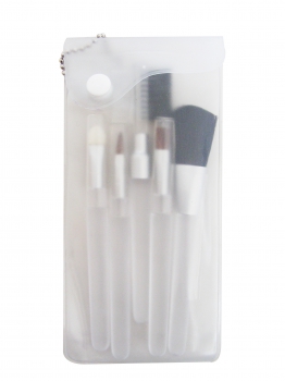 6,5 x 14 x 0,2 cm Plástico traslúcido. Set de 5 piezas: 1 brocha, 2 pinceles, 1 pincel difumador y un peine para cejas. Estuche plástico transparente con cierre broche y cadena colgante.(2)