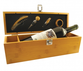 36 x 11,5 x 11 cm. Caja de madera Bamboo, cierre metálico con set de bar en Bamboo y Metal: Cortagota, Vertedor, Tapón y Sacacorchos. Tabique regulable para botellas chicas.(2)