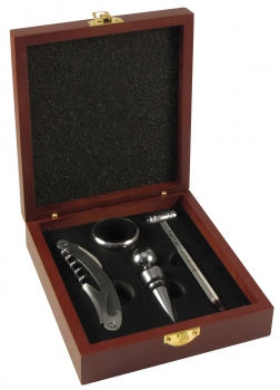 Set de 4 accesorios metálicos de vino en caja de madera barnizada.(1)