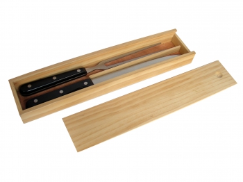 34 x 7,3 x 4,1 cm Juego de cuchilla y trincheta en caja de madera.(2)