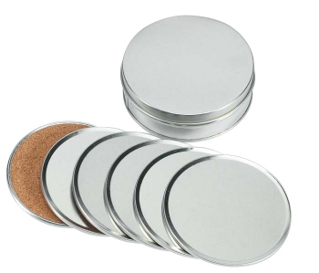 et de 6 posavasos redondos de Aluminio con reverso antideslizante de corcho. Presentación en estuche redondo de aluminio.(1)