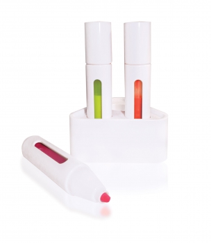 7,5 de lado x 3,5 cm. Plástico. 3 Resaltador push anti dry , con base triangular.