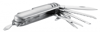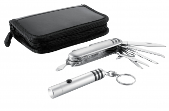 Set de Supervivencia \"XD\", incluye Cortapluma 12 funciones + Llavero-Linterna LED metálica de 9 cm + 3 pilas botón tipo AG3, presentación en elegante Estuche Negro con Gris.(1)