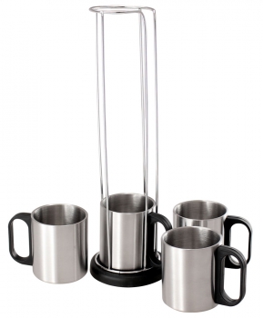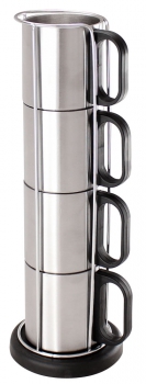 Set Torre Metálica con 4 tazones de Acero Inoxidable, con base plástica redonda negra. Presentación en caja de cartón blanco.