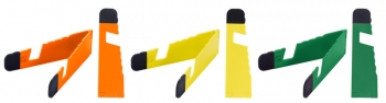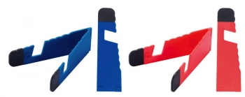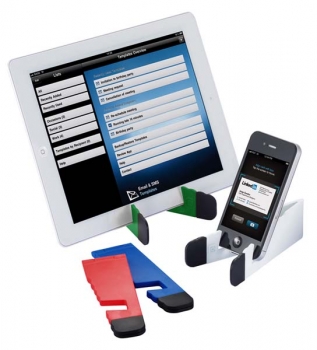 Soporte plástico abatible para iPad y Celular, con goma antideslizante en ambos terminales.