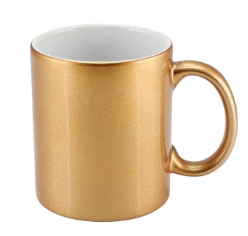 Tazón Cerámico exterior dorado, interior blanco. Con cobertura exterior especial \"Polycoat\" para sublimación. Cada tazón se entrega dentro de su caja individual de cartón blanco. Capacidad: 320 cc. Tamaño: Ø 8 x 9.5 cm. (01)