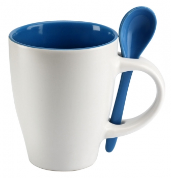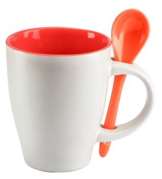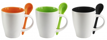 Tazón Cerámico Blanco opaco con interior y cuchara de color. Presentación en caja de cartón blanco.