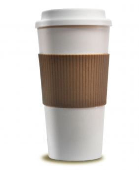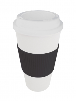 Plástico. Incluye abertura en tapa para beber. Grip térmico de goma imitación cartón corrugado.